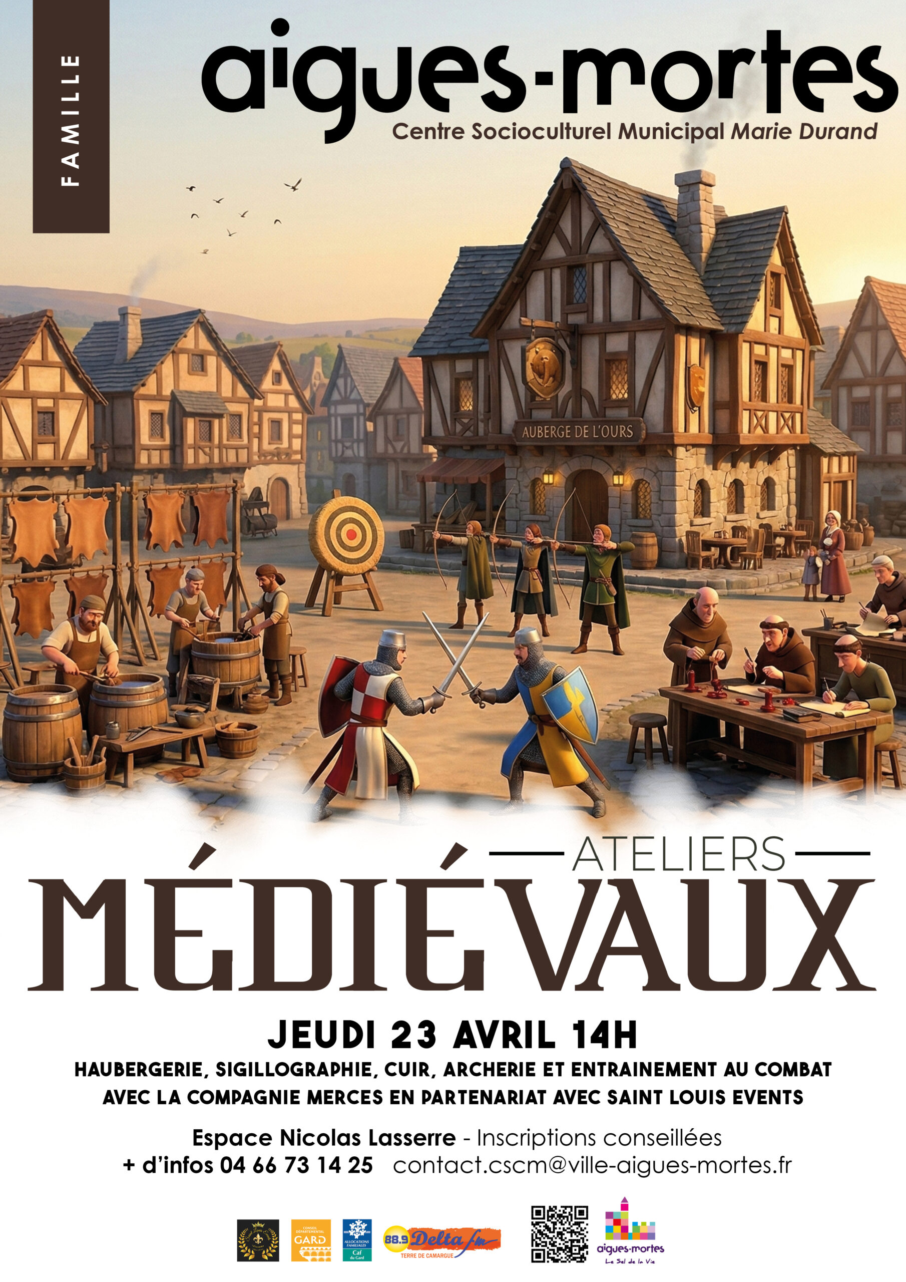Revivez l’époque médiévale : haubergerie, sigillographie, cuir, archerie, entrainement au combat avec la Compagnie Merces et l’association Saint Louis Events. Revivez l’époque médiévale le temps d’une immersion authentique et passionnante, aux côtés de la Compagnie Merces et de l’association Saint Louis Events. Plongez dans un univers où savoir-faire anciens et traditions prennent vie à travers des ateliers variés et interactifs. Découvrez la haubergerie et les techniques de fabrication d’armures, initiez-vous à la sigillographie en créant vos propres sceaux, explorez le travail du cuir et ses multiples usages, ou encore testez votre adresse à l’archerie. Les plus téméraires pourront également participer à des entraînements au combat pour ressentir l’intensité et la rigueur des pratiques médiévales.