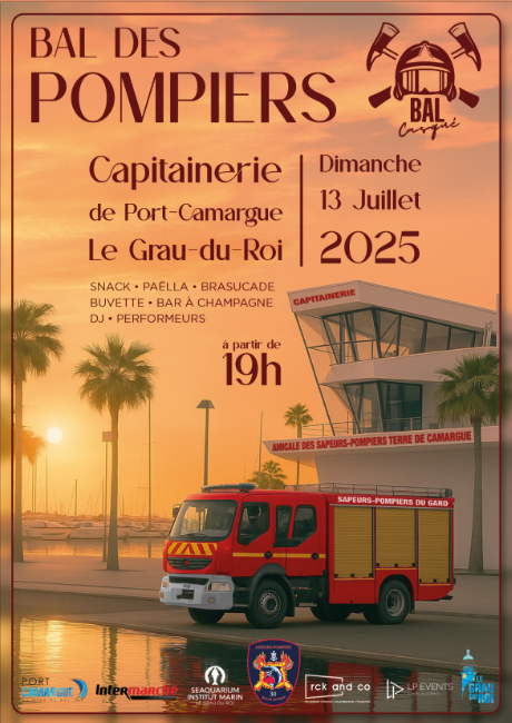 L’Amicale des Sapeurs Pompiers du Grau du Roi, organise son traditionnel Bal. Connus pour leur engagement et leur dévouement à la communauté, vous invite à son traditionnel bal des pompiers. Ce bal est une occasion idéale pour célébrer la veille de la fête nationale française dans une ambiance conviviale et festive pour tous les âges. Rejoignez nous pour une soirée inoubliable. Venez profiter de DJ’S, Performers et Show enflammé dans une ambiance festive au bord de l’eau. Repas et boisson seront également disponibles pour agrémenter cette soirée ! Venez nombreux, entre amis ou en famille, pour partager des moments de joie et de bonne humeur. On compte sur vous, à très vite.