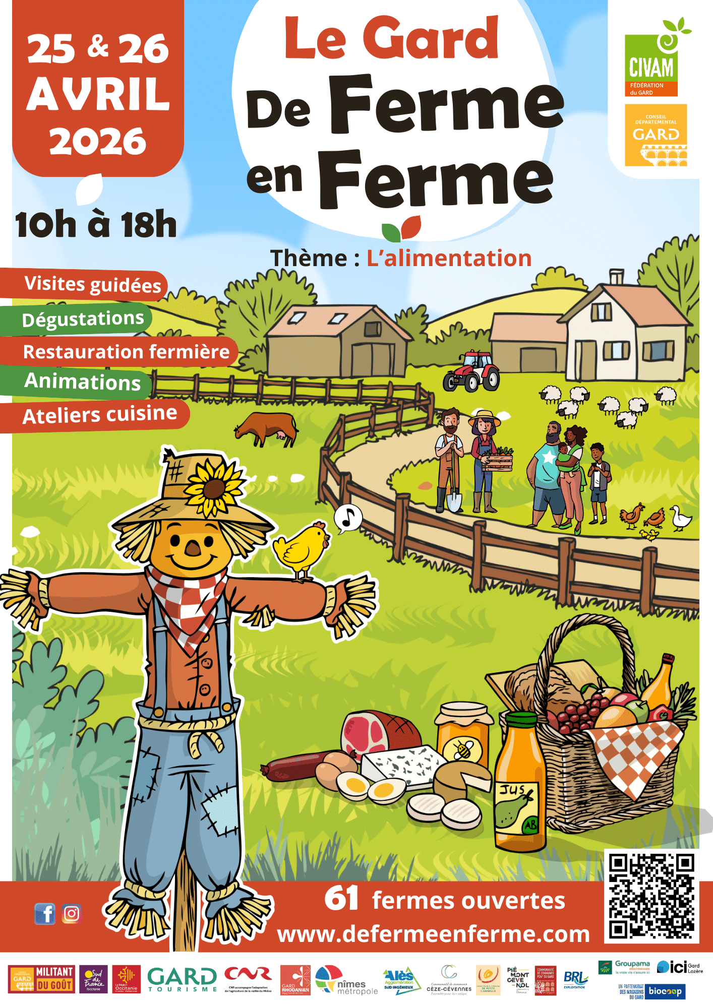 61 Fermes du Gard, vous accueillent les 25 et 26 avril 2026 de 10h00 à 18h00 a participer à des visites guidées, des dégustations, un repas fermier, des animations et des ateliers cuisine. Venez nombreux rencontrer nos exploitants agricole, cultivateurs, éleveurs, fermiers ... de notre beau territoire de Camargue.