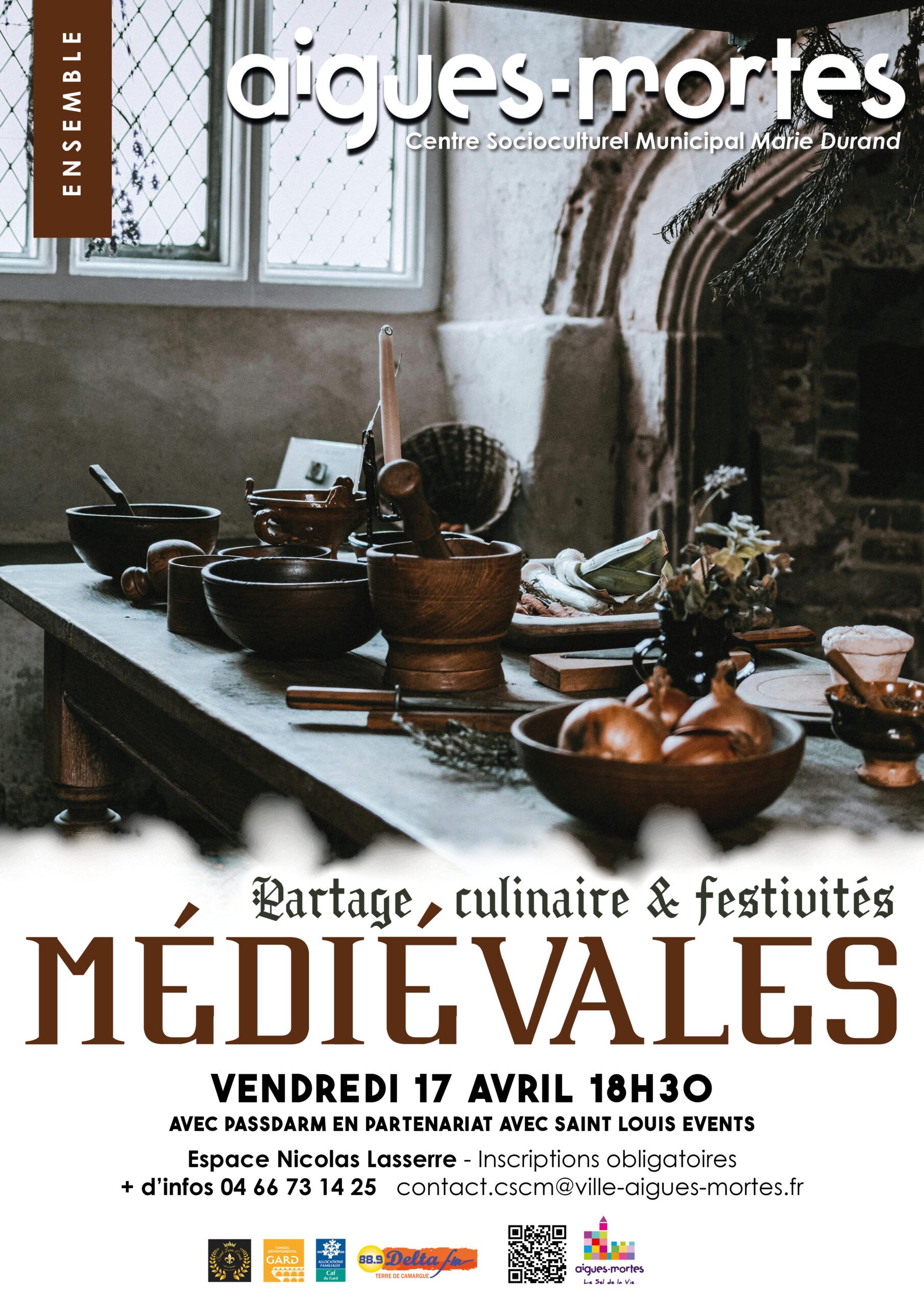 Autour d'animations avec Passdarm (combat à l'épée et saynètes) et en partenariat avec Saint Louis Events, plongez au cœur de Moyen-âge en partageant vos spécialités de cette époque. Plongez dans l’ambiance du Moyen Âge grâce aux animations (combats à l’épée et saynètes), en partenariat avec Saint Louis Events. Venez vivre un moment unique et convivial en partageant vos spécialités d’époque : apportez vos mets et vos couverts, et laissez-vous emporter par ce voyage festif et gourmand hors du temps !