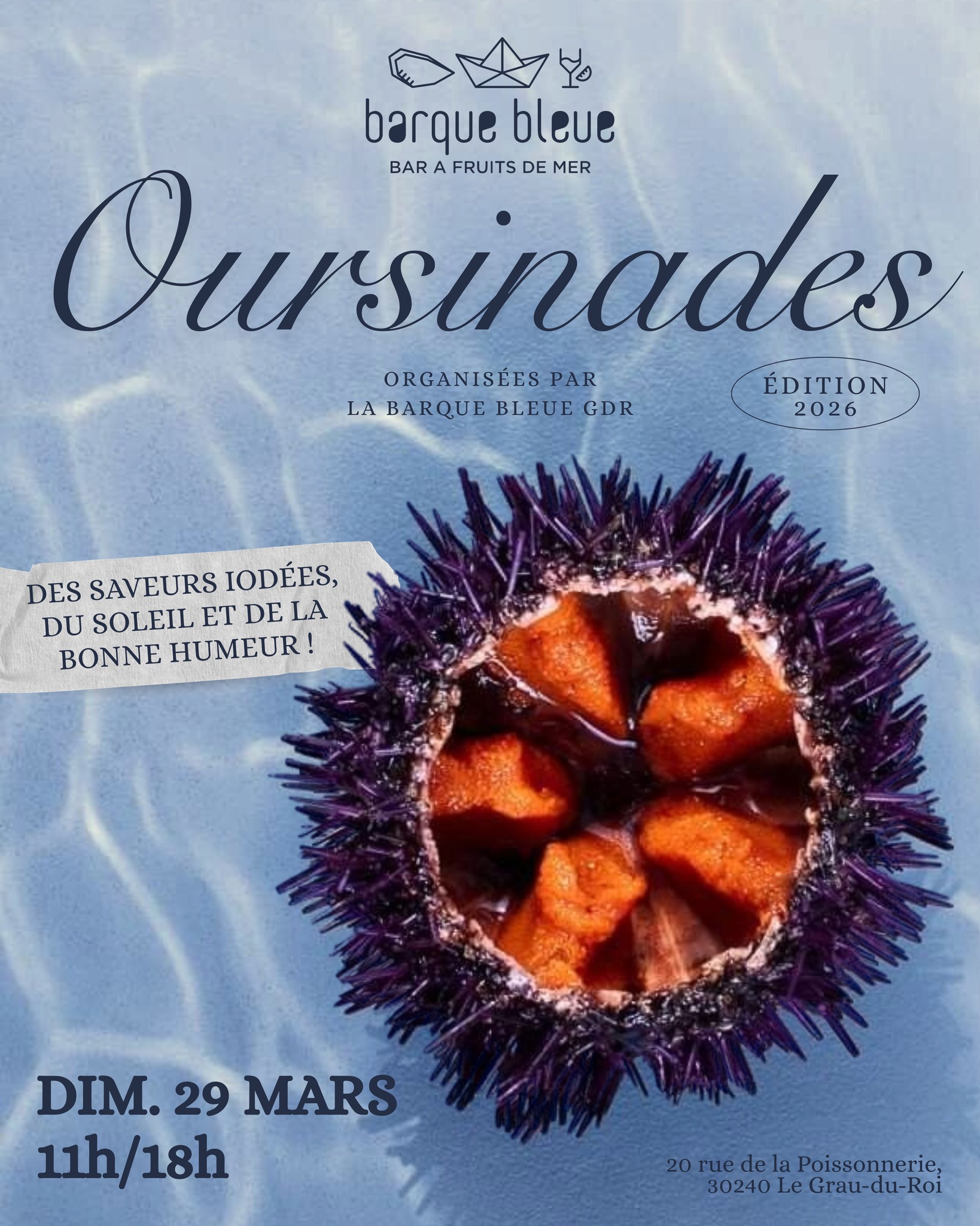 Préparez vous à célébrer l'arrivée des beaux jours avec les incontournables Oursinades de La Barque Bleue ! Le dimanche 29 mars 2026, dès 12h, rendez-vous sur la place du marché du Grau-du-Roi pour une journée festive inoubliable. Au programme : ▫️Fruits de mer et oursins frais ▫️Vin blanc & rosé, bières ▫️DJ & Groupe de musique live ▫️Bonne humeur et ambiance festive ! ️ Dimanche 29 mars 11h00/18h00 20 rue de la Poissonnerie, 30240 Le Grau-du-Roi