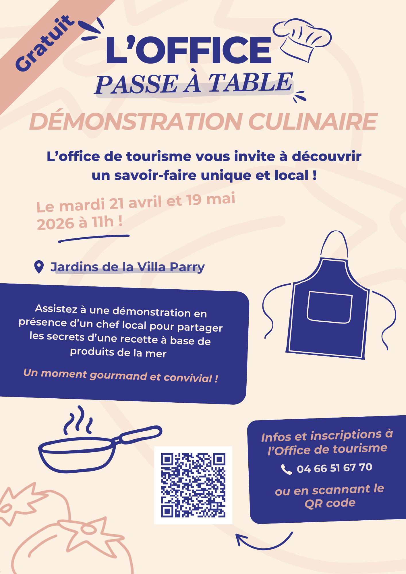 Venez assister à une démonstration culinaire en direct dans les jardins de la Villa Parry par un chef local passionné. Une immersion savoureuse dans les saveurs de la région ! Découvrez les secrets de cuisine d'un chef lors d’une démonstration culinaire dans les jardins de la Villa Parry. Un chef du Grau-du-Roi vous invite à plonger dans l’authenticité de la gastronomie locale. Entre savoir-faire, produits du terroir et anecdotes savoureuses, laissez-vous emporter par cette expérience conviviale et généreuse. Une belle occasion de (re)découvrir les richesses culinaires de notre littoral.