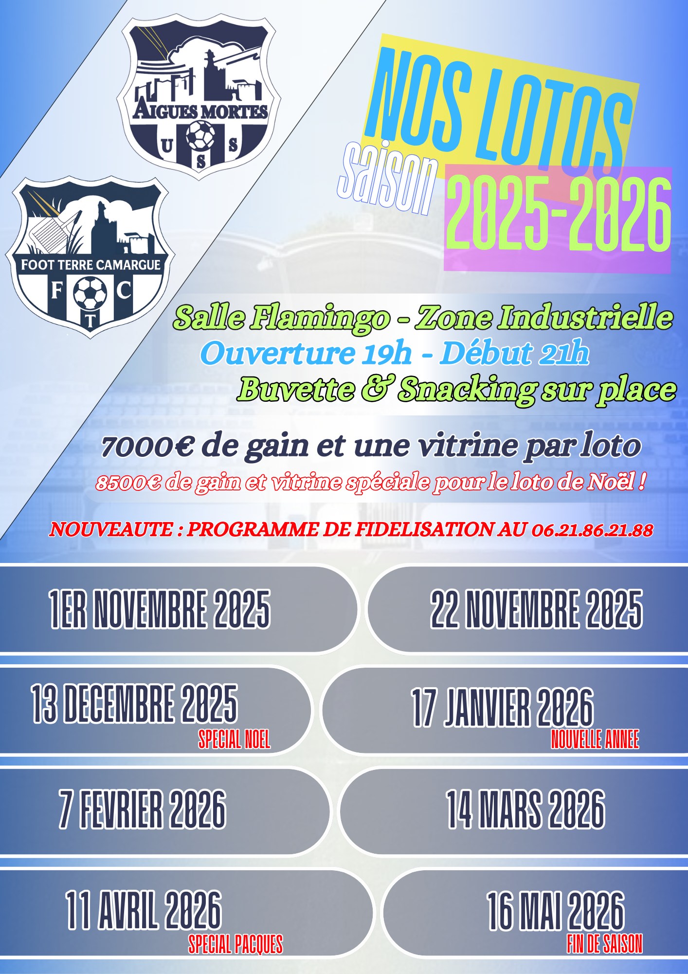 Les loto de l'USSA et Foot Terre Camargue font leur retour. L'ambiance, convivialité et de superbes lots à la clé… ne manquez pas nos grands rendez-vous de la saison.