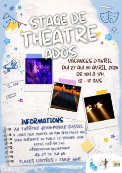 Stage de théâtre ado 66 € L’école municipale des Arts Éric-Turquay, organise un stage de théâtre pour les ados de 12 à 17 ans pendant les vacances d'avril, encadré par Vanessa Mattioli. Stage de théâtre ado 66 € L’école municipale des Arts Éric-Turquay, organise un stage de théâtre pour les ados de 12 à 17 ans pendant les vacances d'avril, encadré par Vanessa Mattioli. Quatre jours de présence obligatoire pour monter un «mini» spectacle qui sera présenté au public jeudi 30 avril à 17h. Au programme : Travail de groupe, mise en scène, expression corporelle, voix, confiance en soi et plaisir de jouer sur une vraie scène de théâtre. Repas tiré du sac le midi. Réservation obligatoire - Places limitées.