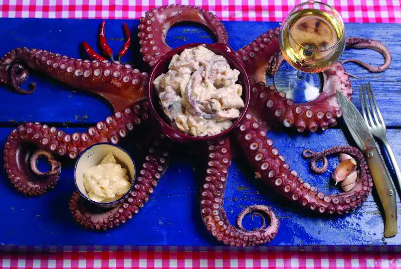 - Du poulpe, pêché localement et cuit dans l’eau jusqu’à devenir fondant